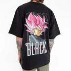 Step into the dark side of Dragon Ball Super with this bold Goku Black design. Featuring a minimalist front print and a striking full-back artwork of Super Saiyan Rose, this shirt is a must-have for fans who love unique and powerful streetwear.